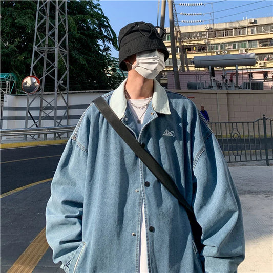 saferido Ins Hong Kong Style Harajuku loose denim jacket men's autumn Korean fashion fried Street jacket casual versatile denim mens