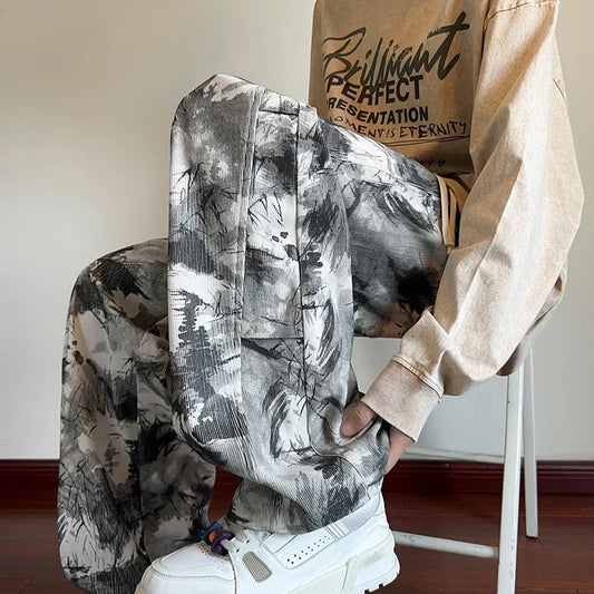 saferido Korean Style Tie-dye Print Casual Pants Black Mopping Trousers Men Autumn Fashion Streetwear Pants Unisex Plus Size 5XL-M