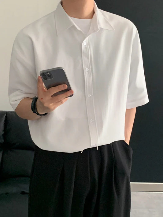 saferido Men Short Sleeve Shirt 2024 Summer New Korean Style Single Breasted Lapel Business Casual Top Solid Color Male