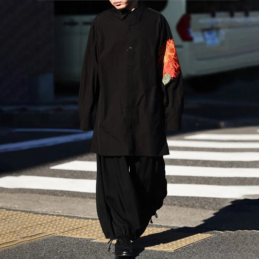 saferido Mens Autumn And Winter Japanese Red Dahlia Embroidered Shirt Floral Retro Essential Dark Style Long-Sleeved Shirt For Men