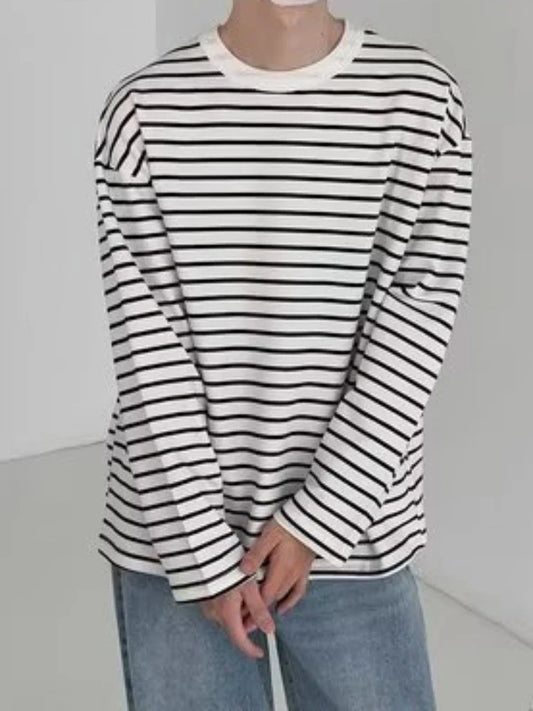 Striped T-shirts Men Long Sleeve Baggy Korean Style Srteetwear Fashion All-match Contrast Color Temperament Tops Daily Leisure