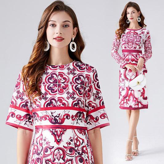 Summer 2025 retro court style temperament short-sleeved round neck waist thin medium and long celadon printed hip-wrapped dress