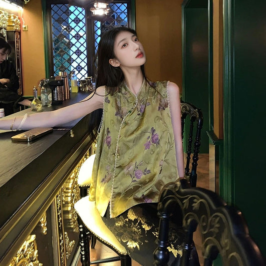 Summer new national style light luxury printed vest retro celebrity loose and thin meat cover premium top M6057