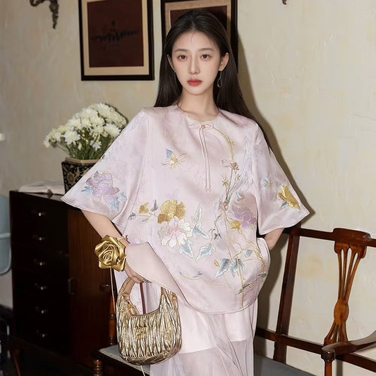 summer new Chinese ancient style Chinese style high-end exquisite embroidered printed top skirt two-piece set M5099