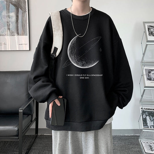 Winter Warm Sweatshirts New Men Simple Stroke Moon Graphic Pullovers Oversized Korean Style Man Letter Print O Neck Tops