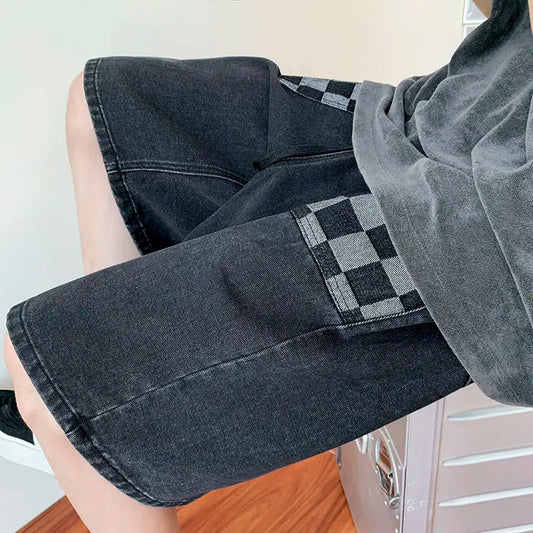 saferido New Summer Men's Stitching Plaid Short Jeans Korean Fashion Streetwear Blue Baggy Denim Shorts Wide Leg Large Pocket Shorts