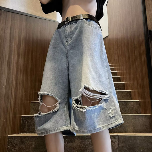 saferido skater boy outfits Summer Fashion Brand Thin Knee Ripped Jeans Men's American-Style Loose Straight Wide-Leg Pants Trendy Shorts