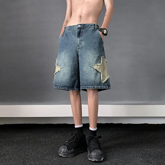 saferido Patch embroidered denim shorts for men's summer American high street capris casual breeches loose fitting youth pants