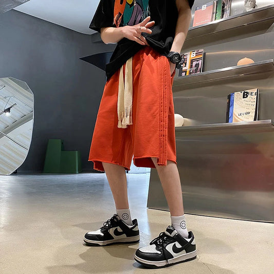 saferido Solid Loose Shorts Thin Summer Sports Thousand Pleated Straight Wide-leg Casual Pants Oversized 5-point Pants Men's White Orange