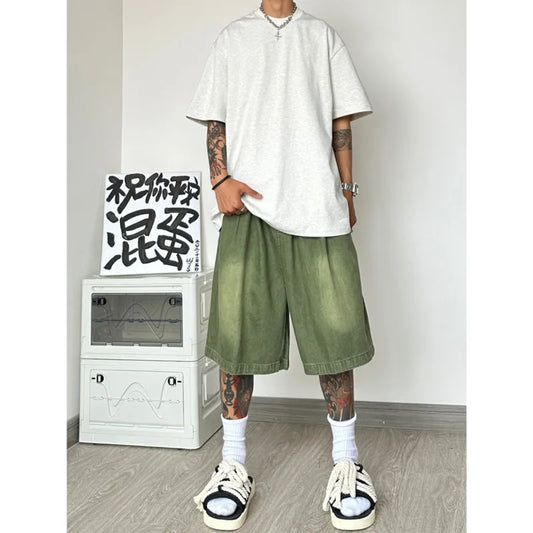 saferido Summer Gradient Denim Shorts Men's Fashion Retro Denim Shorts Mens Streetwear Korean Loose Hip-hop Straight Denim Shorts Men