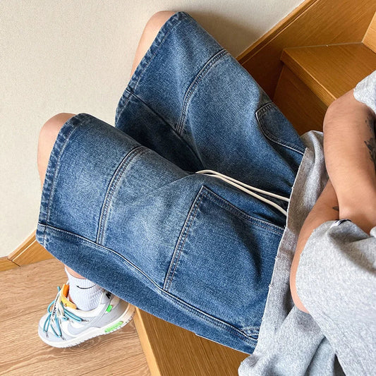 saferido Summer New Men's Denim Shorts Korean Street Loose Casual Shorts Fashion Elastic Waist Stitching Blue Five-point Pants