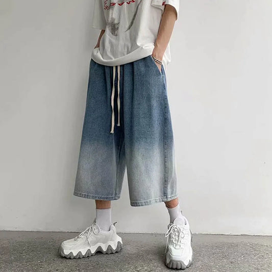 New Summer Men's Denim Shorts Casual Summer Shorts Elastic Waist Wide Leg Shorts Drawstring Baggy Jeans Shorts Male Summer