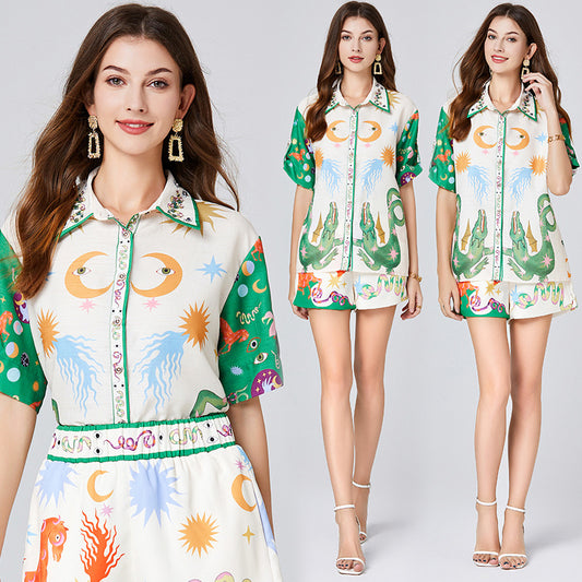 Popularan station set women's summer printed heavy industry beaded shirt + rubber band waist shorts two-piece set, with lining