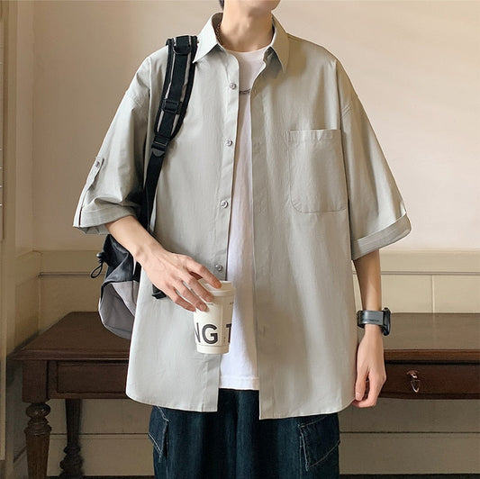 Spring/Summer Men's Shirt Japanese Solid Color Shirt Short Sleeve Men's Summer Half Sleeve Top Coat Trendy Hong Kong Style Shirt