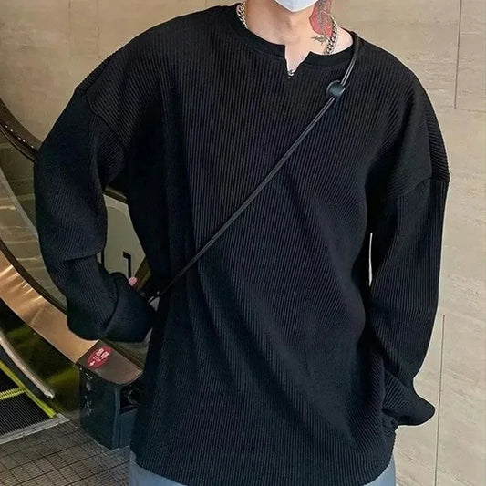 Spring White V-Neck Pleated Stripe T-Shirt Men Large Size Silky Soft Long Sleeved T-Shirt Summer Loose Bottomed Shirt