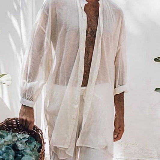 Summer Men's Beach Long Shirt Casual Loose Long Sleeve Lapel Button See Through Thin Shirts Men Clothes Leisure Solid Tops