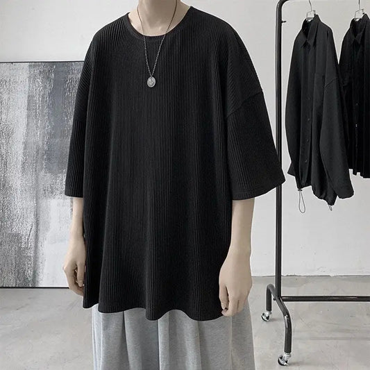 Summer Ice Silk T Shirt for Men Short Sleeve Solid Color Vertical Stripe American Loose Round Neck Half Sleeve Oversized T-shirt