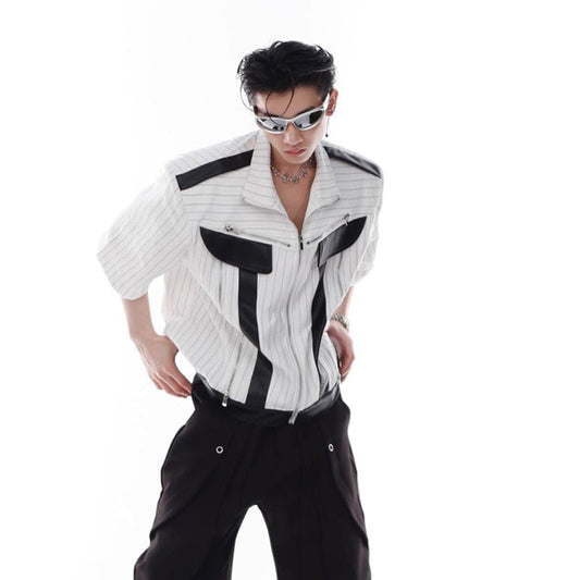 Summer Niche Design Stripe Men's Shoulder Pad Jackets Trendy Contrast Color Patchwork Short Sleeve Fashion PU Tops
