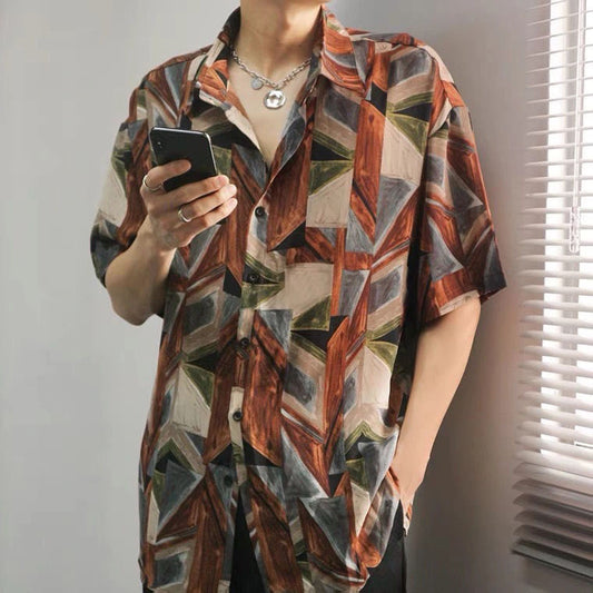 Summer New Vintage Short Sleeved Shirts for Men Geometric Print Loose Casual Beach Hawaiian Fashion Floral Shirt Streetwear
