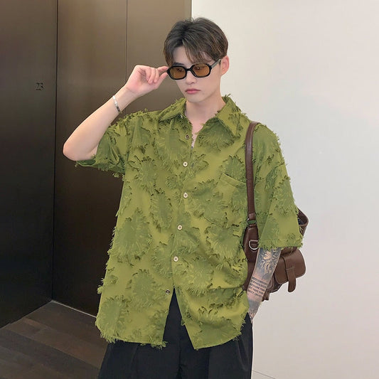 New Fashion Male Shirt Loose Burrs Spiliced Niche Design Solid Color Short Sleeve Tops Spring Trendy Men's Top