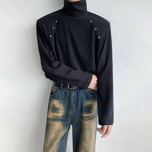 saferido Rivet High Collar White Y2k Long-Sleeved T-Shirt Mens Spring And Autumn Street Fashion Casual Inner Bottoming Shirt Pullover Top