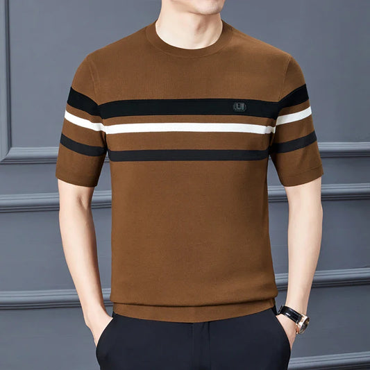 saferido Round Neck Men's Knitwear Spring 2024 Silk Velvet Half Sleeve Thick T-shirt Business Gentleman