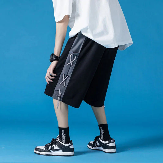 saferido Solid Color Loose Shorts Thin Summer Sports Stitching Straight Wide-leg Casual Pants Oversize Strapped 5-point Sweatpants Men's