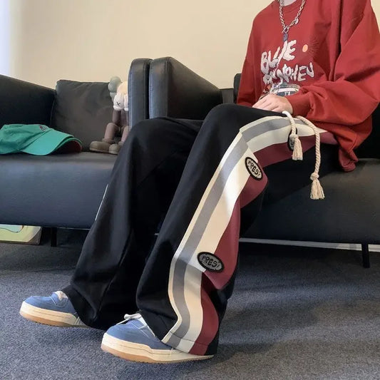 saferido Japanese Retro Casual Pants Men's Fitting Straight Leg Pants College Style Wide Striped Patchwork Drawstring Sweatpants Autumn