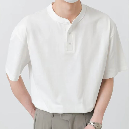 Men's Clothing Luxury Henry Collar T-Shirt Vintage Casual Button-down Solid Color Short Sleeve Tees for Men Breathable Leisure