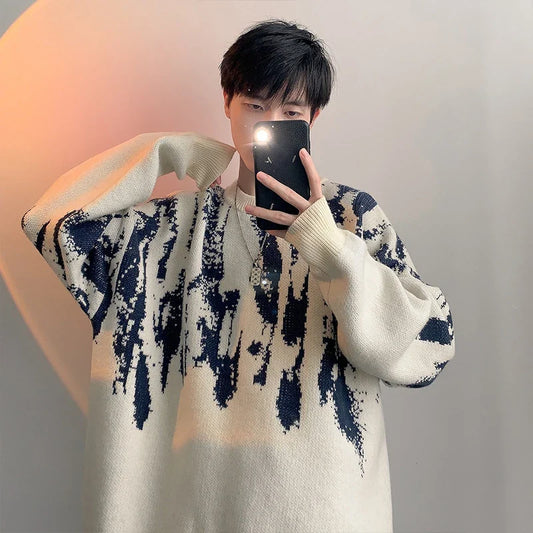 Autumn Clothing Men's Knitted Printed Luxury Jacquard Pullovers Sweater Solid Color Loose O Neck Long Sleeve Vintage Knitwear