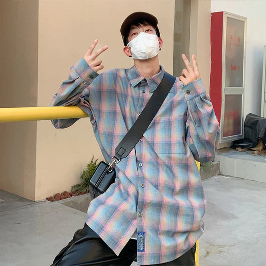 saferido Colorful Plaid Shirt Men Fashion Vintage Shirt Men Streetwear Loose Long Sleeved Shirt Mens Oversized Casual Shirts M-2XL
