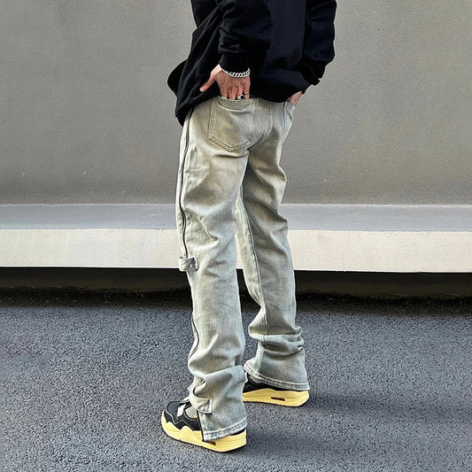saferido guys fits Vintage Washed Distressed Jeans Men's Summer Loose Overalls Korean Style Trendy Wide Leg Straight Pants