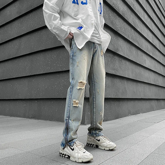 saferido Hole Ripped Washed Vintage Men Hip Hop Jeans Trousers West Ankle Zipper Punk Distressed Male Denim Pants
