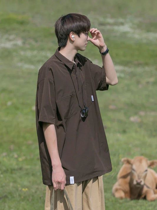 saferido Japanese Half Zip Lapel Shirt Men's Summer Trend Vintage Brown Short Sleeve T-shirt Oversize Retro Cityboy Workwear Top