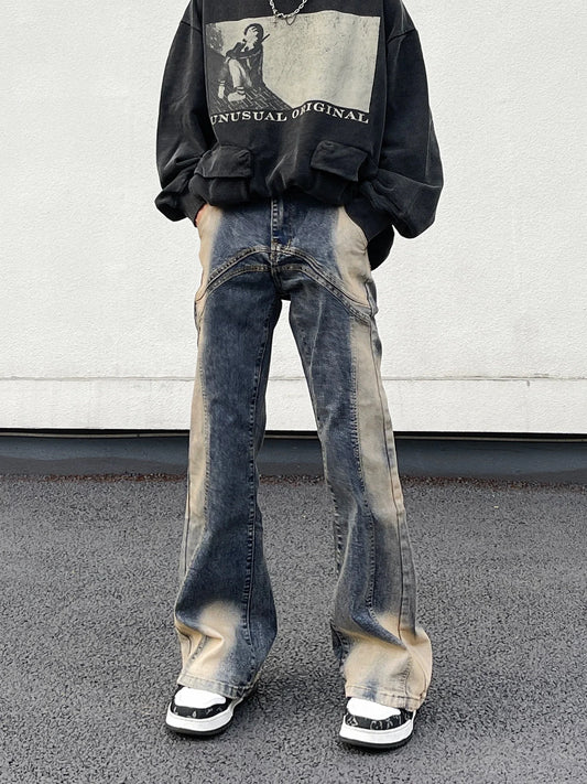 saferido Jeans High Street American Vintage Wash Harajuku Y2K Spliced Jeans Men's Loose Flare Design Feel Pants
