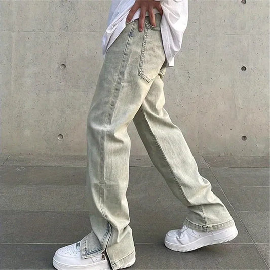 saferido Jeans Men's Y2K Vintage Straight Leg Pants Solid Color Button Pocket Split Zipper Loose Trousers Spring Summer Male Clothing 035