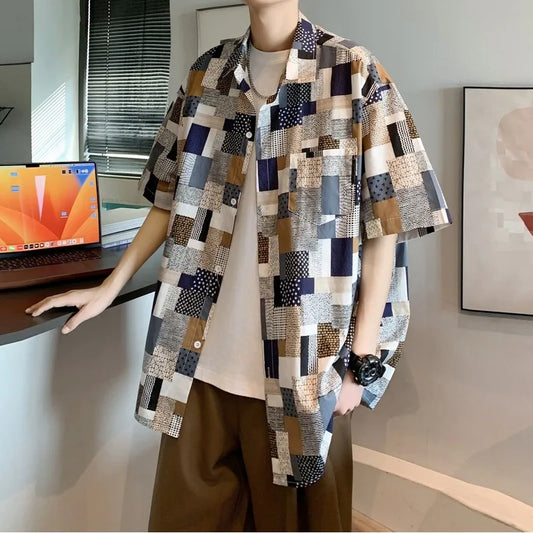 saferido Korean Mens Vintage Short Sleeve Dress Shirt Trend Couple Hawaiian Loose Print Blouses Shirts 2024 Summer Designer Men Clothing
