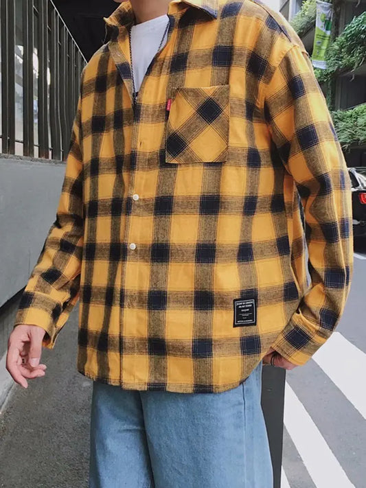 saferido Men Harajuku Color Block Plaid Shirt Mens Streetwear Thick Shirts Long Sleeve Male Vintage Korean Fashions Clothes