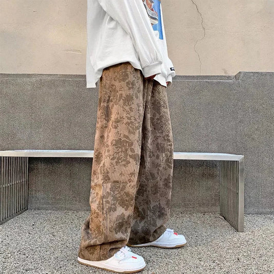 saferido Men Casual Pants 2024 New Spring Autumn Vintage Floral Corduroy Y2k Wide leg Oversize Harajuku Pant Male Straight Long Trousers