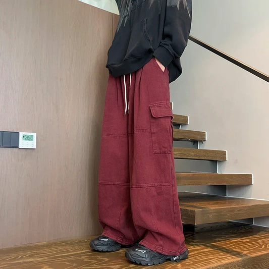 saferido Men's Pure Color Cargo Jeans Simple All-match Wide Leg Pants Trousers Men Hip Hop Streetwear Oversized 90s Vintage Fashion Denim