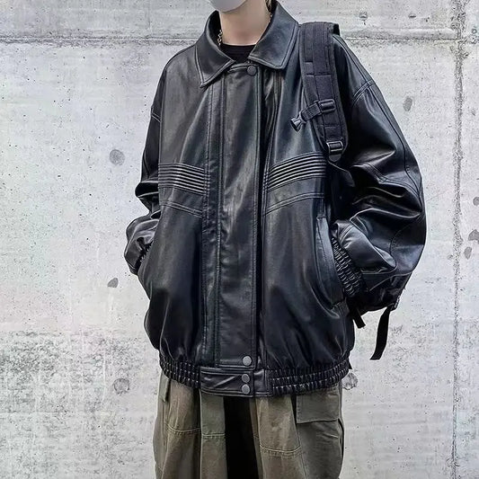 saferido Oversized VIntage Men's Leather Jackets PU Biker Coat Autumn Faux Leather Bomber Jacket 90s Big Pockets Windbreaker Overcoat