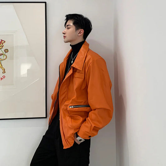 saferido Orange Men PU Leather Jacket Male Short Coats Spring Winter Zipped Oversized Vintage Streetwear Lapel Jackets
