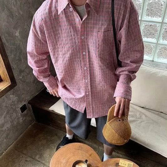 saferido Pink Plaid Shirts Men American High Street Vintage All-match Teens Streetwear Teens Couples Baggy Summer Autumn Y2k Tops Chic