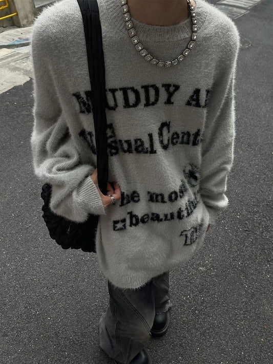 saferido Sweater Vintage Soft Glutinous Imitation Mink Wool Sweater Knitted Sweater Oversize Couple Fashion Autumn and Winter New Top Hip Hop