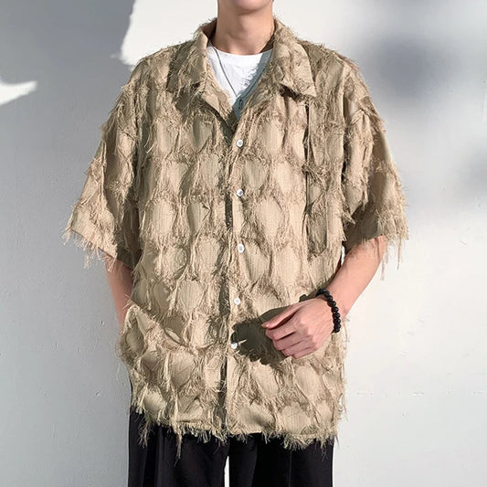 saferido Y2K Mens Shirts Summer Short Sleeve Button Lapel Tassel Desig Shirts Men Streetwear Vintage Solid Color Oversize Shirt For Male