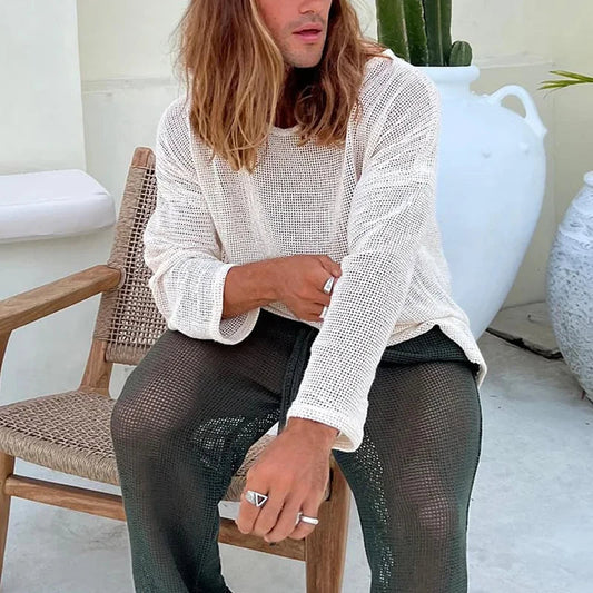 Sexy See Through Mesh T-shirts Men Casual O Neck Long Sleeve Hollow Out Tops Mens Vintage Solid Color Breathable Mesh T Shirt