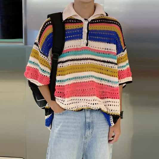 Streetwear Mens Knitting Tops Summer Vintage Striped Contrast Color Knitted Polo Shirt Men New Casual Short Sleeve Knit T Shirts
