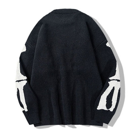 Streetwear Oversized Knitted Sweaters Mens Vintage Skeleton Bone Printed Hip Hop Harajuku Patchwork Casual Pullover Unisex Black