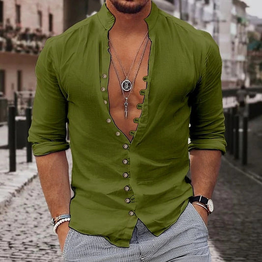 Vintage Men Button-up Casual Solid Color Cotton Linen Tops Stand Collar Long Sleeve Shirts Clothes Mens Fashion Streetwear