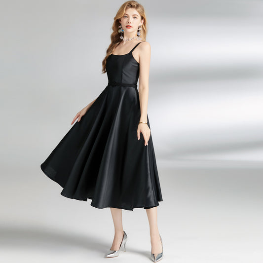 Vintage Hepburn style strap skirt, high-end design, waist and thin medium and long A-shaped fluffy dress